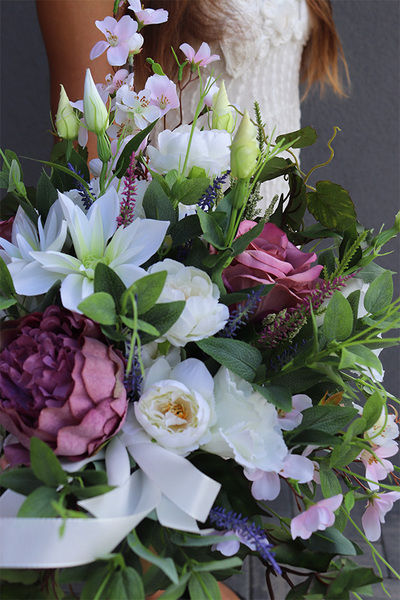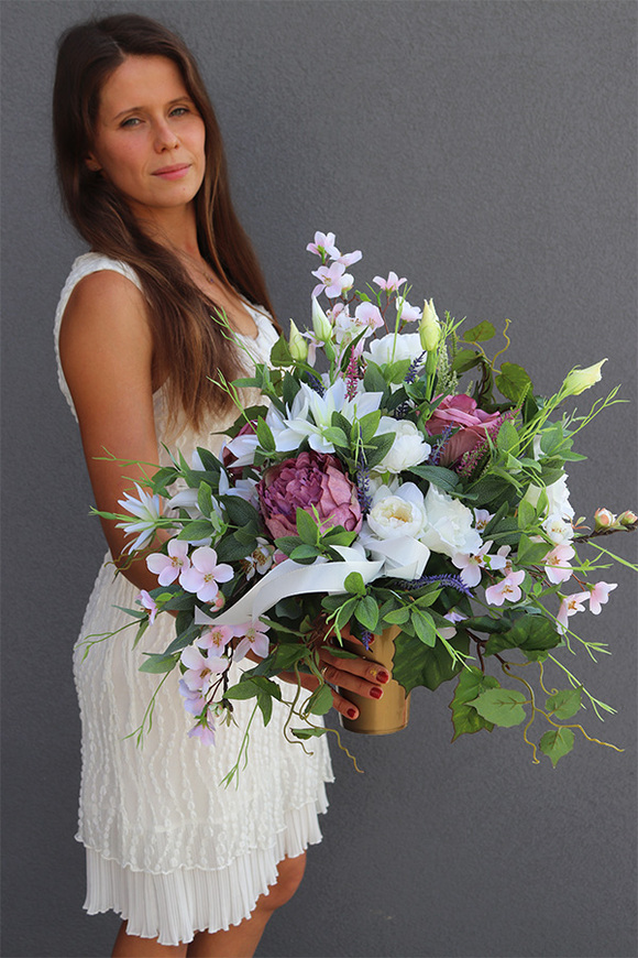 Bukiet Gerista to kompozycja w eleganckiej biało różowej tonacji, przeplatana kwiatami jabłoni. Uzupełnienie tworzą zielone gaązki eustomy, barwinka i bluszczu.
