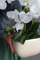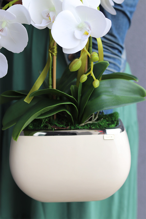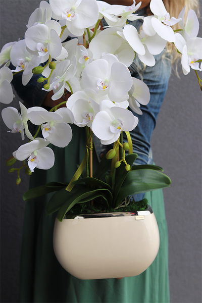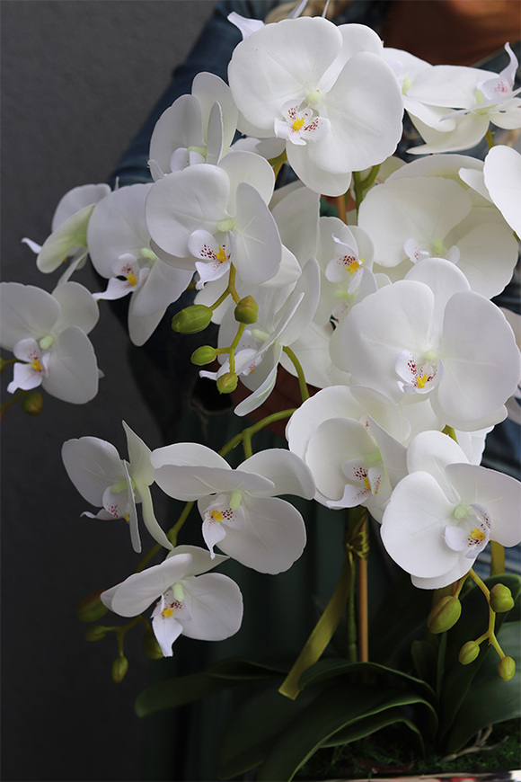 Storczyk w tej kompozycji charakteryzuje się mięsistymi, śnieżnobiałymi kwiatostanami z gumowanej tkaniny, a na ich szczycie pojawia się od kilku do kilkunastu kwiatów i pąków różnej wielkości.