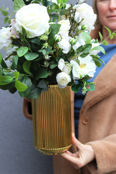 Bajeczne połączenie tych ponadczasowych kwiatów i nowoczesnego kształtu naczynia daje dekorację, która wspaniale będzie wyglądać w kazdym otoczeniu.