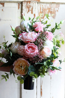 Bukiet nagrobny Gudino skomponowany został ze starannie wyselekcjonowanych sztucznych kwiatów w odcieniach różu, bieli i kremu w otoczeniu zielonych liści.