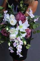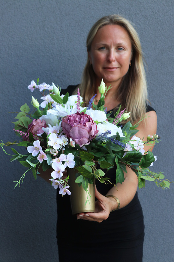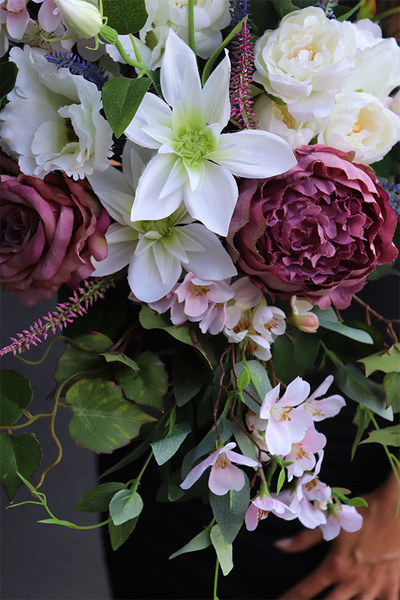 Bukiet Hedia to kompozycja w eleganckiej biało różowej tonacji, przeplatana kwiatami jabłoni i wrzosów . Uzupełnienie tworzą zielone gaązki eustomy, barwinka i bluszczu.