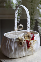 Koszyczek wielkanocny Heflana, przyozdobiony kompozycją z delikatnych suszonych i sztucznych kwiatów w ponadczasowej beżowej kolorystyce. Wiosenna dekoracja wykonana została wyłącznie z wysokiej jakości elementów.
