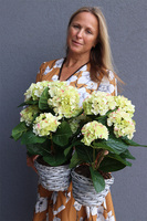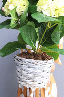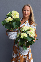 Piękna kompozycja z hortensji w odcieniach naturalnych kwiatów hortensji - cytrynowej żółci z domieszką różu, starannie obsadzone w jasnym, plecionym koszu. Sadzonki hortensji imitujące żywą roślinę są gęsto ukwiecone, o pięnych, zielonych liściach.