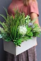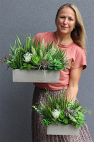 Oryginalna kompozycja sztucznych sukulentów w klasycznej, betonowej donicy, która wspaniale sprawdzi się w nowoczesnej przestrzeni biurowej lub domowej. Soczysta zieleń sukulentów i traw, różnorodność kształtów tworzą barwną, wyjątkową aranżację.