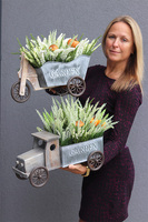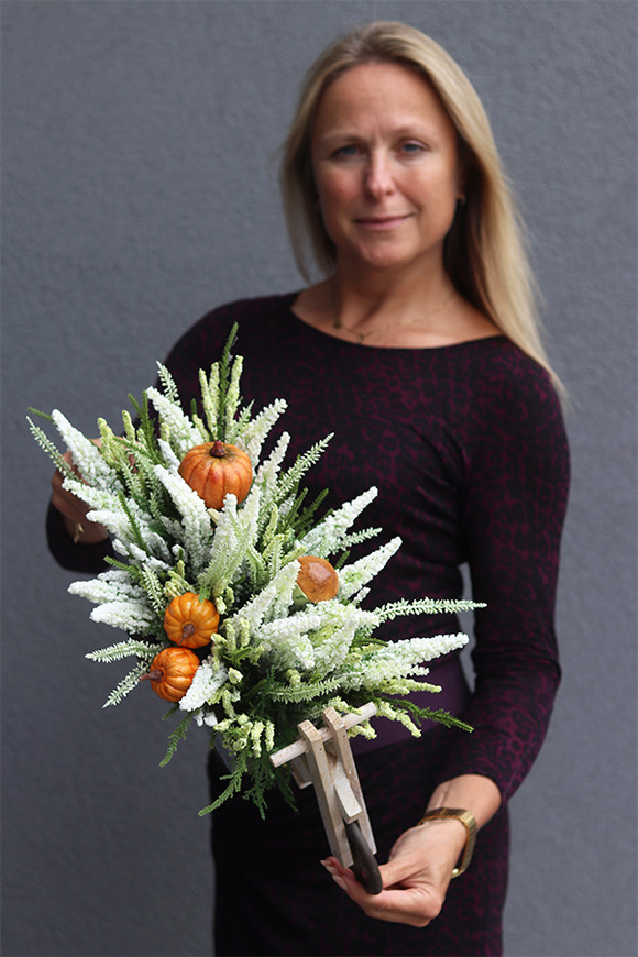 Piękna kompozycja w uroczej, drewnianej trójkołówce ogrodnika, wypełniona wysokiej jakości sztucznymi gałązkami wrzosów w białych barwach. Wyraźnym akcentem są artystycznie przyczepione, soczyście pomarańczowe dynie.