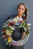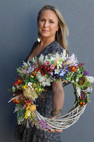 Uroczy wianek w bajecznych ogrodowych kwiatów odchodzacego lata. Wianek o delikatnej, subtelnej formie, skomponowany na naturalnym wiklinowym podkładzie. Kwiaty tworzą piękny bukiet kolorystyczny, przeplatają sie w nim drobne kwiatostany hortensji ogrodowej, pióropusze traw, dmuchawców, ostów i korali krzewów.