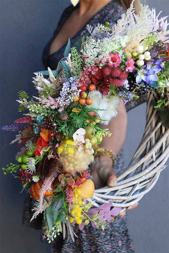 Wianek jest barwną dekoracją na drzwi, ścianę, taras i na stół, jako stroik, a także elegancką propozycja prezentu dla bliskiej osoby.