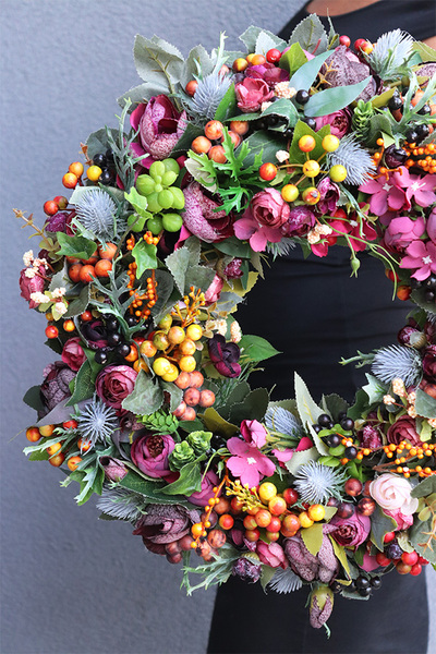 Piękna, barwna dekoracja na drzwi, ścianę, taras i na stół, jako stroik.