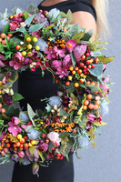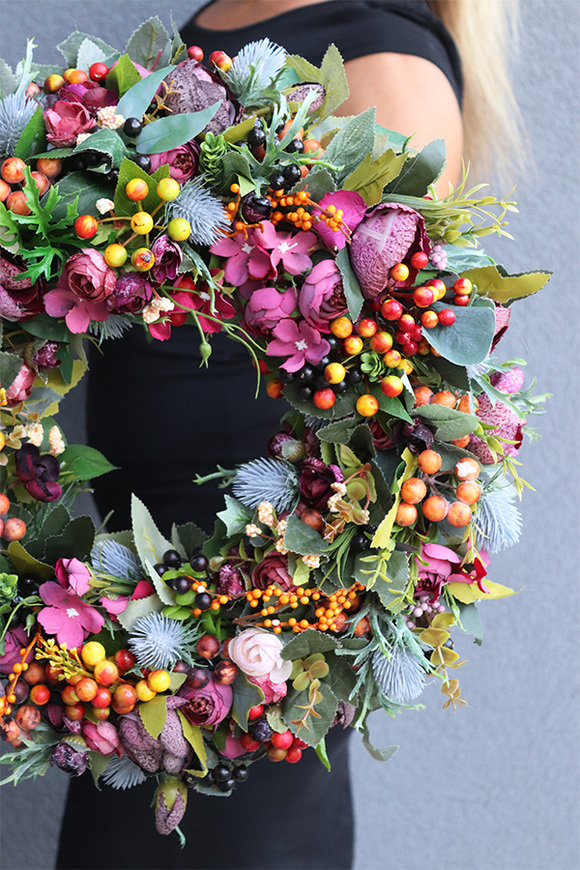 Gustowny wianek w zgaszonych zieleniach i przyćmionych burgundach, oddający doskonale klimat nadchodzącej dojrzałej roku - jesieni.