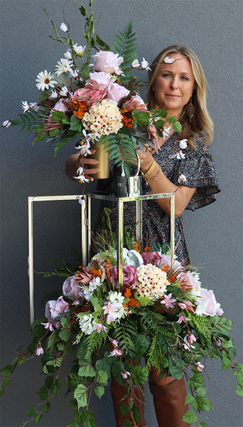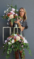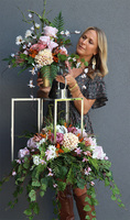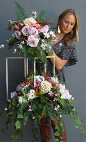 Zachwycająca kompozycja z kwiatów w tonacji zgaszonego fioletu i kremu, ułożona z pięknych, sztucznych kwiatów najwyższej jakości. Dekorację tworzą hortensję, róże, margerytki, kolorowe, jesienne trawy bagienne i karczoch. Całość zanurzona w ciemnej zieleni pędów bluszczu i paproci, z delikatnym pomarańczowym akcentem....