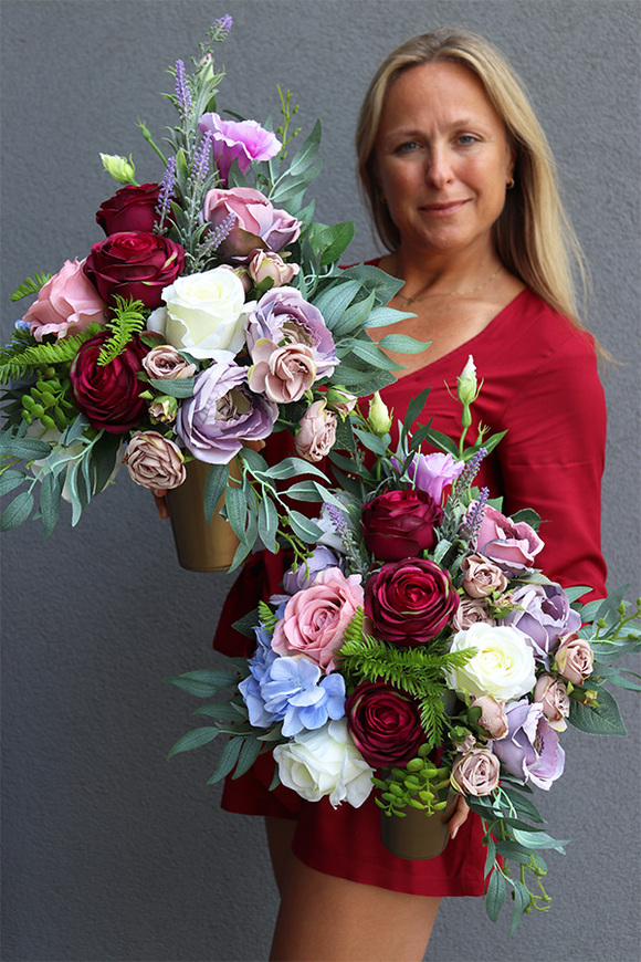 Piękna, bogata wiazanka nagrobna na sztucznej igle, skomponowana w barwach bakłażana, zgaszonych fioletów, różu i kremu, wyróżnia się bogactwem kwiatów. Jest wyjątkowo efektowną i przyciagajacą uwagę kolorystyką i doskonałym kształtem dekoracją. Wiązanka suto wypełniona piękną zielenią różnorodnych liści, gustownie wkomponowanych w całość.