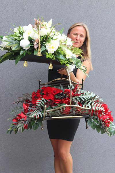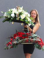Wyjątkowe, niezwykle eleganckie kompozycje nagrobne Wspomnienie. Dekoracje w dwóch różnych koszach i wariantach kolorystycznych. Piękna, biała bogata kompozycja White tonąca w ciemnej zieleni liści, ułożona z kwiatów peoni, eustomy i róż, oraz energetyczna czerwień storczyków kontrastująca ze zgaszoną zielenią podłużnych liści paproci i połyskujaca czernią leśnych korali w artystycznie stylizowanym metalowym koszu z ażurowymi ściankami - Wspomnienie Red. Wspomnienie White ułożone w szykownym, czarnym metalowym koszu ze złotymi zdobieniami.