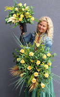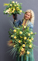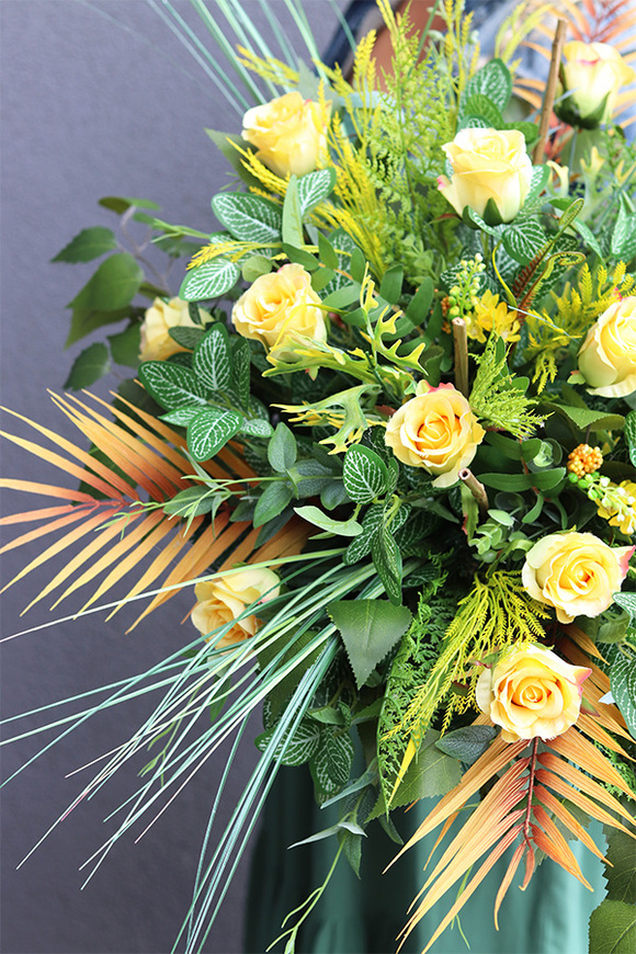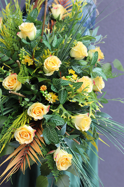 Złota Róża to elegancka kompozycja pełna wyszukanych, wysokiej jakości sztucznych róż w odcieniach ciepłej żółci, doskonale imitujących naturalne, wonne kwiaty. Wiązanka jest gustownie skomponowana na podkładzie ze sztucznej igły, wzbogacona zielonymi liśćmi paproci, sinoniebieskimi trawami stepowymi i cynamonowymi palmy kokosowej.