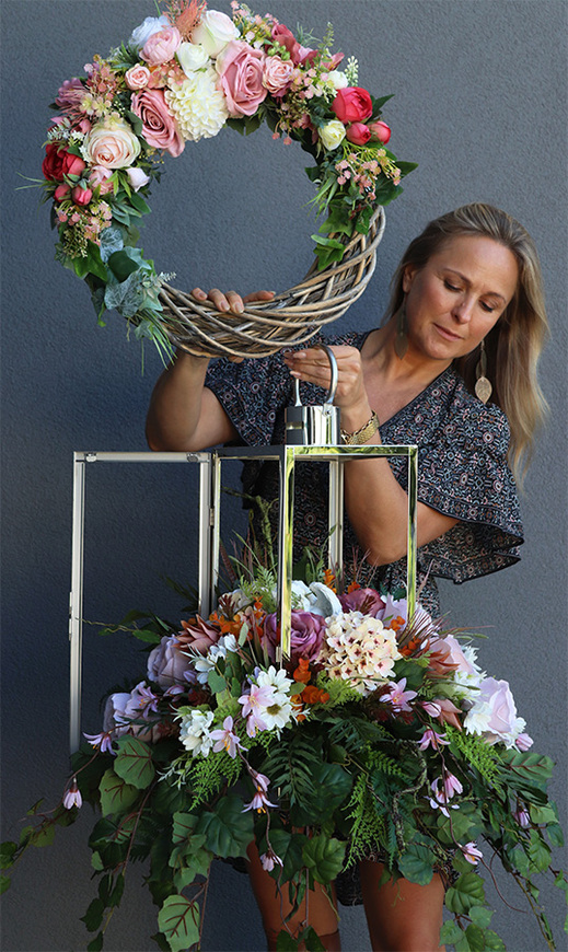 W zestawie do kwiatowego lampionu skomponowano wianek na grubej wiklinie, częściowo ozdobiony pastelowymi kwiatami i drobnymi listkami.
