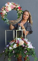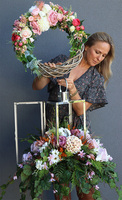 Zachwycająca kompozycja z kwiatów w tonacji zgaszonego fioletu i kremu, ułożona z pięknych, sztucznych kwiatów najwyższej jakości. Dekorację tworzą hortensję, róże, margerytki, kolorowe, jesienne trawy bagienne i karczoch. Całość zanurzona w ciemnej zieleni pędów bluszczu i paproci, z delikatnym pomarańczowym akcentem. Dekoracja pięknie wkomponowana ...