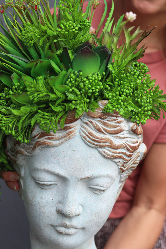 Soczystozielone sukulenty o różnych kształtach umieszczono w oryginalnej donicy, imitującej antyczną rzeźbę. Nedia jest niepowtarzalną dekoracją, która doskonale komponuje się w każdej przestrzeni.
