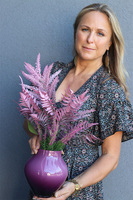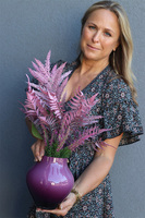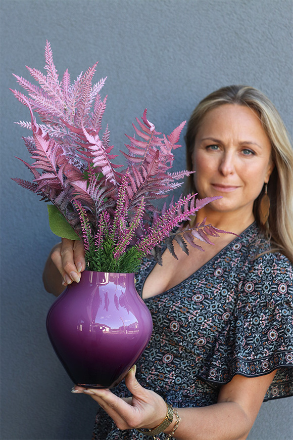 Fiolena to elegancka, subtelna kompozycja w tonacji różowo-fioletowej, pełna wyszukanych, wysokiej jakości sztucznych roślin w pięknym, szklanym, cieniowanym naczyniu o barwie wrzosu.
