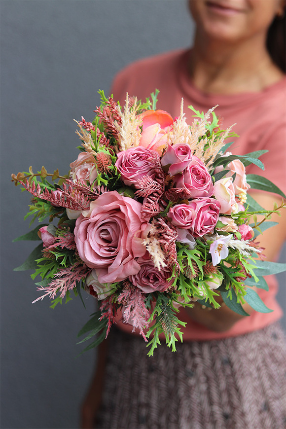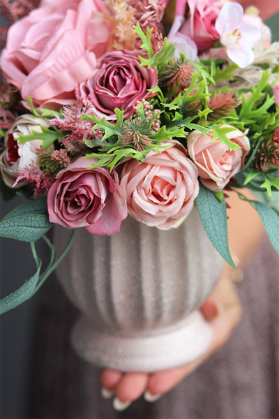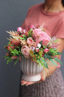 Kompozycja Kedina Glamour w ceramicznej niewielkiej amforze, ułożona w stylu japońskiej ikebany z kwiatów róż, kwiatów jabłonki,pióropuszy suchych traw i niebieskiej zieleni. Całość w odcieniach różu i kremu.
