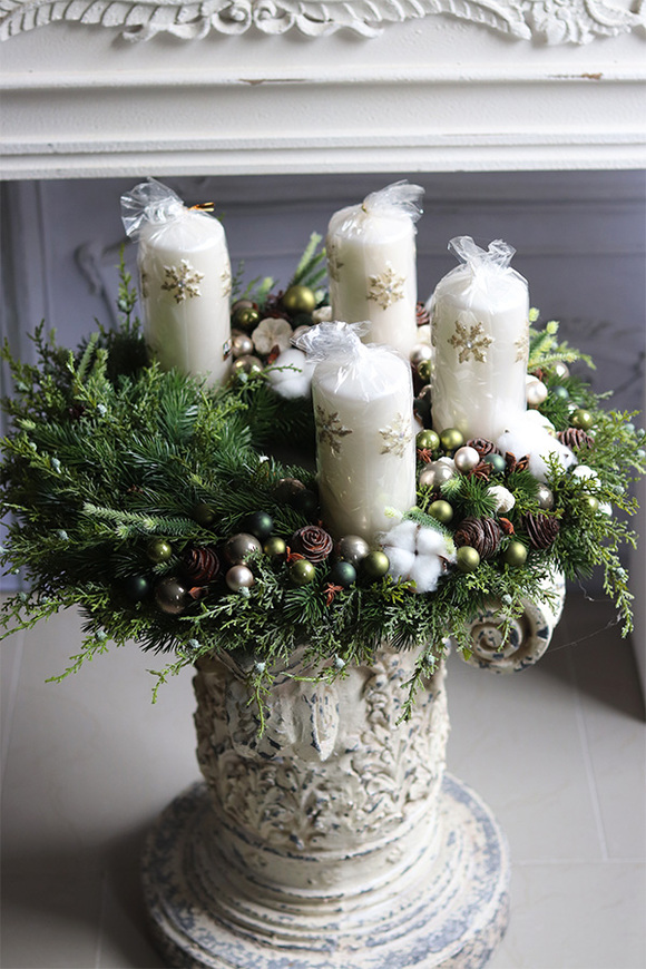 Elegancki stroik adewntowy w formie wianka z czterema świecami na metalowych podstawkach, umocowanych wśród zielonych gałązek i świątecznych dodatków.