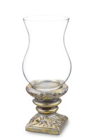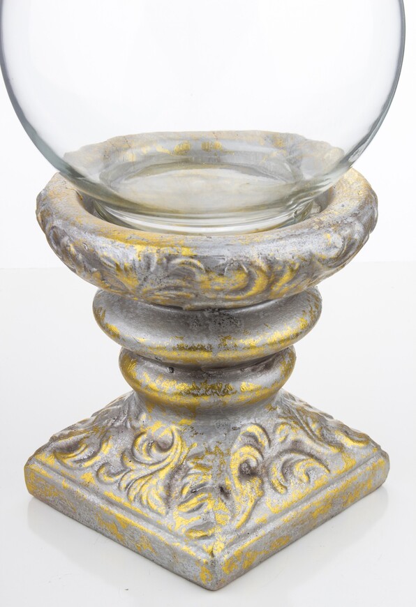 Uroczy szklany lampion na stylizowanej, złotej ceramicznej podstawce, z pięknym, szklanym kloszem osłaniającym świecę.