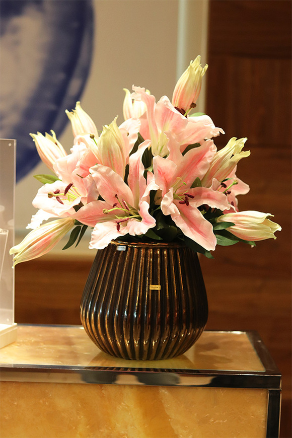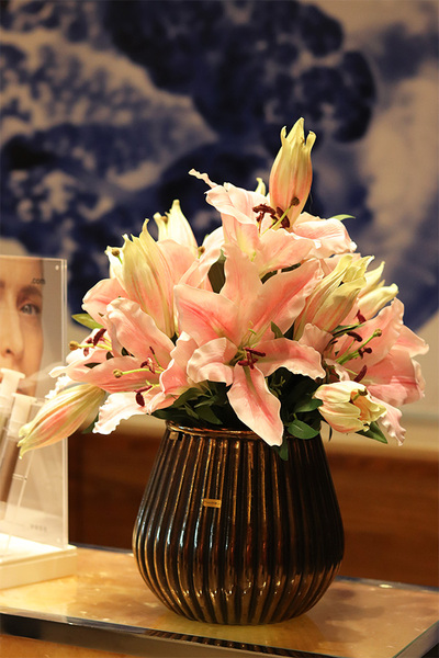 Gęsty bukiet różowych lilii ułożony w ceramicznym naczyniu w kolorze miedzianym to wyrazisty dodatek do modnych wnętrz.