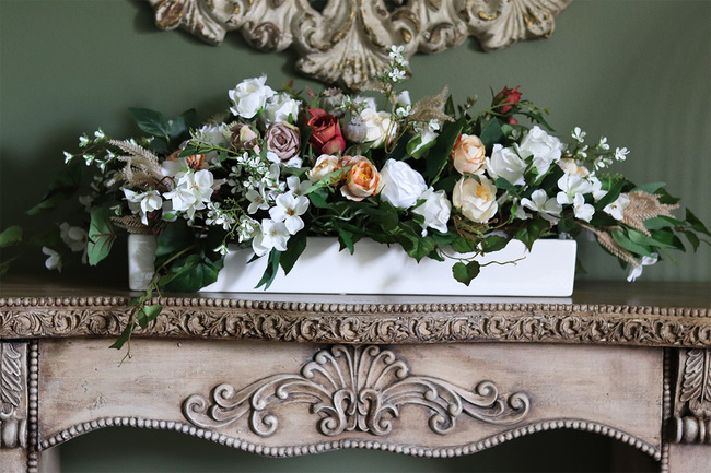 Przepiękna kompozycja pełna wysokiej jakości sztucznych kwiatów umieszczonych w podłużnym, ceramicznym naczyniu.
