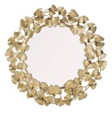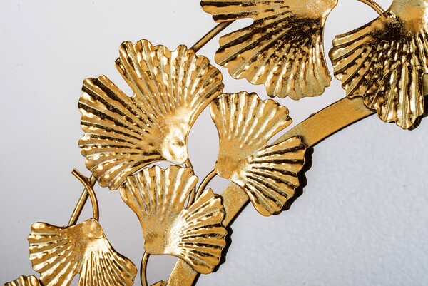 Eleganckie, stylizowane okrągłe lustro w fantazyjnej, złotej ramie z metalowych liści miłorzębu japońskiego. Lustro stanowi piękny element dekoracyjny hollu, przedpokoju oraz sypialni.
