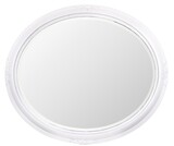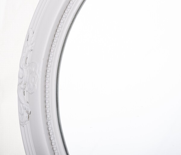 Eleganckie, stylizowane lustro w ozdobnej, białej, owalnej ramie. Lustro stanowi piękny element dekoracyjny hollu, przedpokoju oraz przytulnej sypialni.