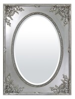 Eleganckie, stylizowane lustro w ozdobnej, srebrnej ramie. Lustro stanowi piękny element dekoracyjny hollu, przedpokoju oraz sypialni.