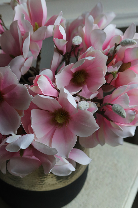 Piękna dekoracja wiosenna - gęsty bukiet kwiatów magnolii, ułożony w ceramicznym naczyniu w kolorze złotym, z czarną podstawą.