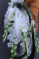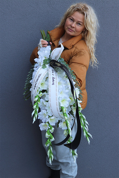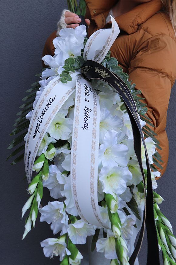 Nagrobny bukiet ułożony z pełnych elegancji, białych mieczyków z dodatkiem niebieskosinych liści eukaliptua. Wiązanka przewiązana klasyczną, porzebową wstęgą z napisem.