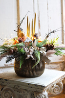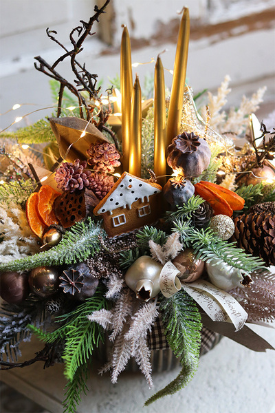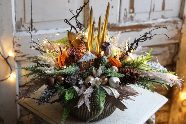 Świąteczny stroik z czterema złotymi świecami, w eleganckim, miedzianym naczyniu z malowanymi makówkami, korzeniami i piernikowymi ozdobami.