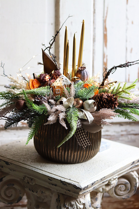 Świąteczny stroik z czterema złotymi świecami, w eleganckim, miedzianym naczyniu z malowanymi makówkami, korzeniami i piernikowymi ozdobami.