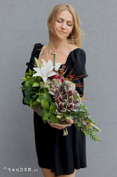 Przepiękna kompozycja pełna wyszukanych i wysokiej jakości sztucznych kwiatów - cymbydium i lilii w otoczeniu bujnej zieleni.