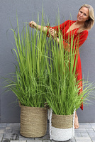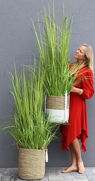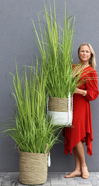 Egzotyczna kompozycja dwóch sztuk wysokich traw pampasowych, zaaranżowanych w etnicznych koszach w stylu Boho. Wyjątkowa dekoracja, doskonale imitująca naturalne rośliny, wspaniale uzupełni każde wnętrze, taras, holl, łazienkę.