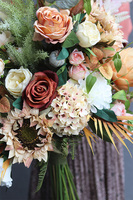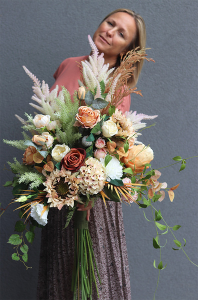 Wyjątkowy bukiet sztucznych kwiatów, niezwykle okazałych w barwach piasku, zgaszonego różu, cappuccino. Kompozycja wzbogacona kilkoma odcieniami zieleni i zwisającymi pędami barwinka. Lekkości dodają jej pióropusze traw i suszu.
