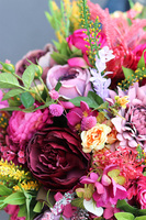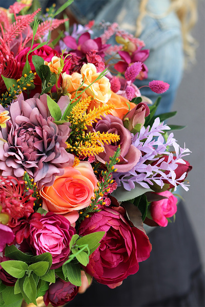 Dekoracja pyszni się pięknymi peoniami, dostojnymi różami i różyczkami, kwiatami żółtych bylin i wrzosów, pióropuszami traw. Bukiet przetykany artystycznie opadającymi pędami zielonego bluszczu. Hellisano to zachwycająca kwiatowa kompozycja, przywodząca na myśl te niezwykłe bukiety uwiecznione na XVII wiecznych obrazach holenderskich malarzy.