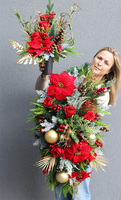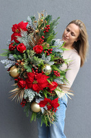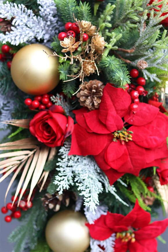 Zachwycająca wiązanka nagrobna na sztucznej igle, skomponowana z ośnieżonych gałązek świerku i tui, okazałych kwiatostanów czerwonej poinsecji i róż, korali leśnych krzewów i szyszek. Świateczny nastrój dekoracji podkreślają złote bombki, liście palmy i brokatowe gałązki. Kompozycja tworzy aranżację wyróżniającą sie na każdym pomniku.