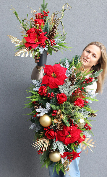 Zachwycająca wiązanka nagrobna na sztucznej igle, skomponowana z ośnieżonych gałązek świerku i tui, okazałych kwiatostanów czerwonej poinsecji i róż, korali leśnych krzewów i szyszek. Świateczny nastrój dekoracji podkreślają złote bombki, liście palmy i brokatowe gałązki. Kompozycja tworzy aranżację wyróżniającą sie na każdym pomniku.