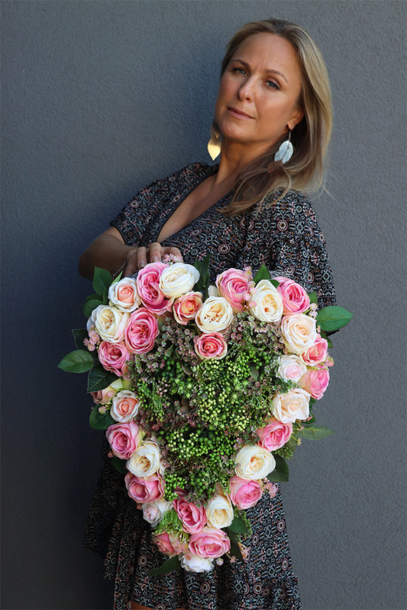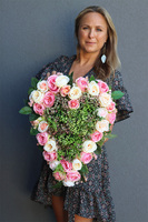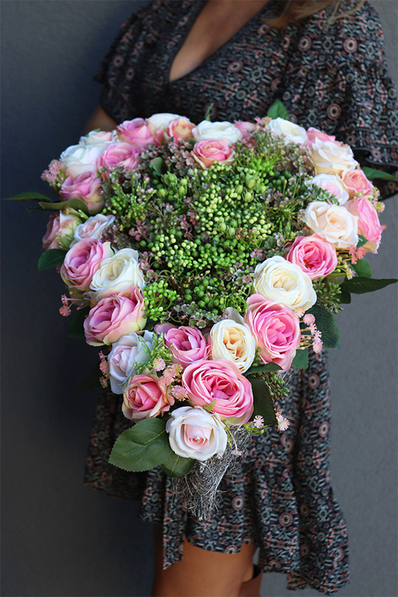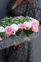 Zachwycająca wiązanka nagrobna w kształcie serca, utkana z pastelowych róż na bazie delikatnych, zielonych listków i kremowych sukulentów, na pięknej, ciemnoszarej podstawie z naturalnych gałązek drzew. Kompozycja tworzy aranżację wyróżniającą się na każdym pomniku.