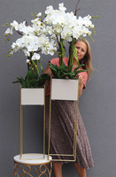 Okazałe białe storczyki Duo Italiano w białych donicach na złotych stelażach, pasujących zarówno do wnętrz nowoczesnych, jak i tych klasycznych.