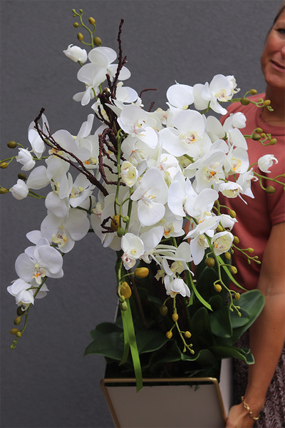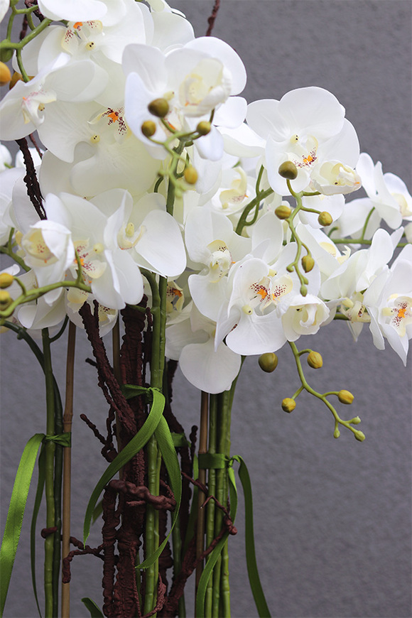 Storczyk w tej kompozycji charakteryzuje się mięsistymi, białymi kwiatostanami, a na ich szczycie pojawia się od kilku do kilkunastu kwiatów i pąków różnej wielkości.