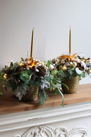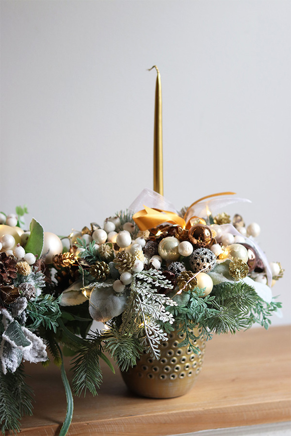 Zachwycający świąteczny stroik w efektownej biało-złotej kolorystyce. Stroik pełen jest pięknych ozdób - bombek, szyszek i kokardek. Całość została zwieńczona smukłą złotą świecą i ułożona na niewielkim metalowym naczyniu. Zachwycający świąteczny stroik w efektownej biało-złotej kolorystyce. Stroik pełen jest pięknych ozdób - bombek, szyszek i kokardek. Całość została zwieńczona smukłą złotą świecą i ułożona na niewielkim metalowym naczyniu.
