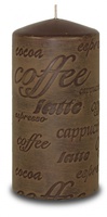 Klimatyczna świeca w kształcie walca z wygrawerowanymi nazwami naparów kaw. Uroczy dodatek w każdej kuchni, jadalni czy też do kawiarnianego stolika.