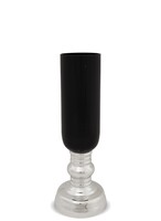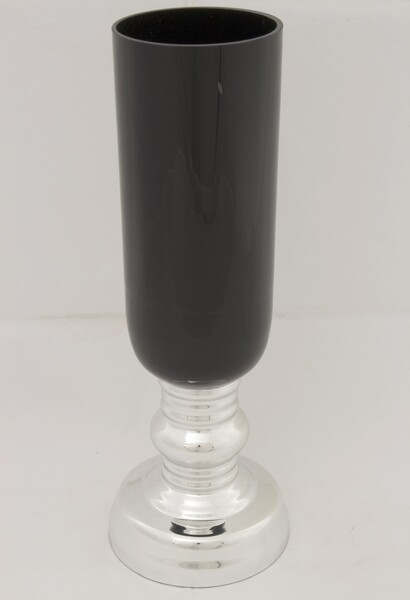 Elegancki czarno-srebrny szklany lampion, na ozdobnej, toczonej podstawie, w kształcie walca. Lampion doskonale eksponuje światło świec. Jest klasyczną dekoracją w każdym wnętrzu.