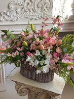 Przepiękna wiosenna kompozycja pełna bogatych, doskonale wykonanych sztucznych kwiatów umieszczona w drewnianym korytku brzozowym.