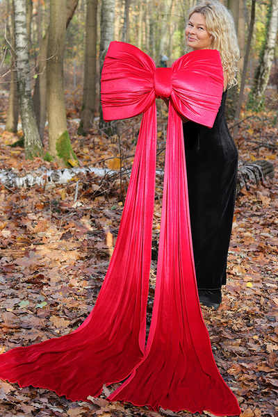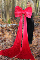 Ogromna pluszowa kokarda z aksamitnego materiału w intensywnym odcieniu czerwieni.