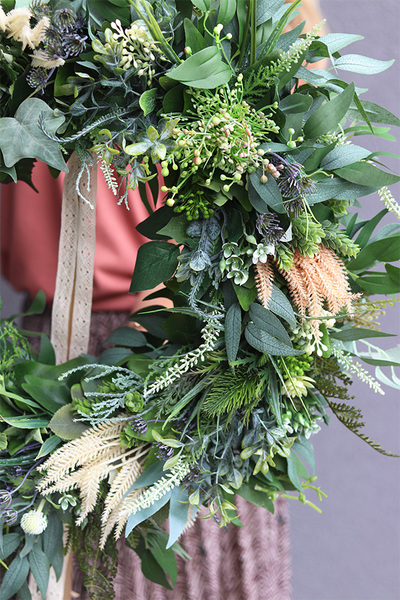 Piękny, zielony wianek w stylu Boho. Luźny, artystyczny splot wianka, z sinozielonych gałązek eukaliptusa, koszyczków ostów i kwiatostanów ażurowego kopru tworzą wyjątkową, lekką kompozycję