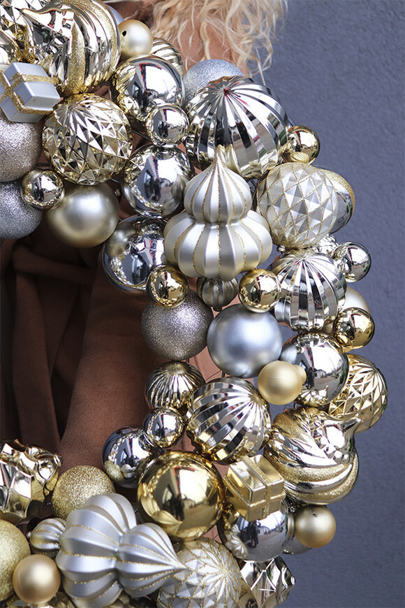 Wianek bożonarodzeniowy Bombki w klasycznej kolorystyce złota i srebra.