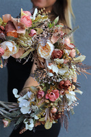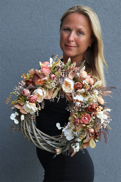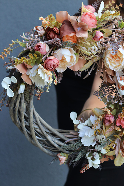 Gustowny wianek w zgaszonych różach, beżach i odcieniach łamanej bieli, bogato utkany na naturalnej wiklinie z kwiatów różyczek i drobnych ogrodowych roślin ozdobnych.